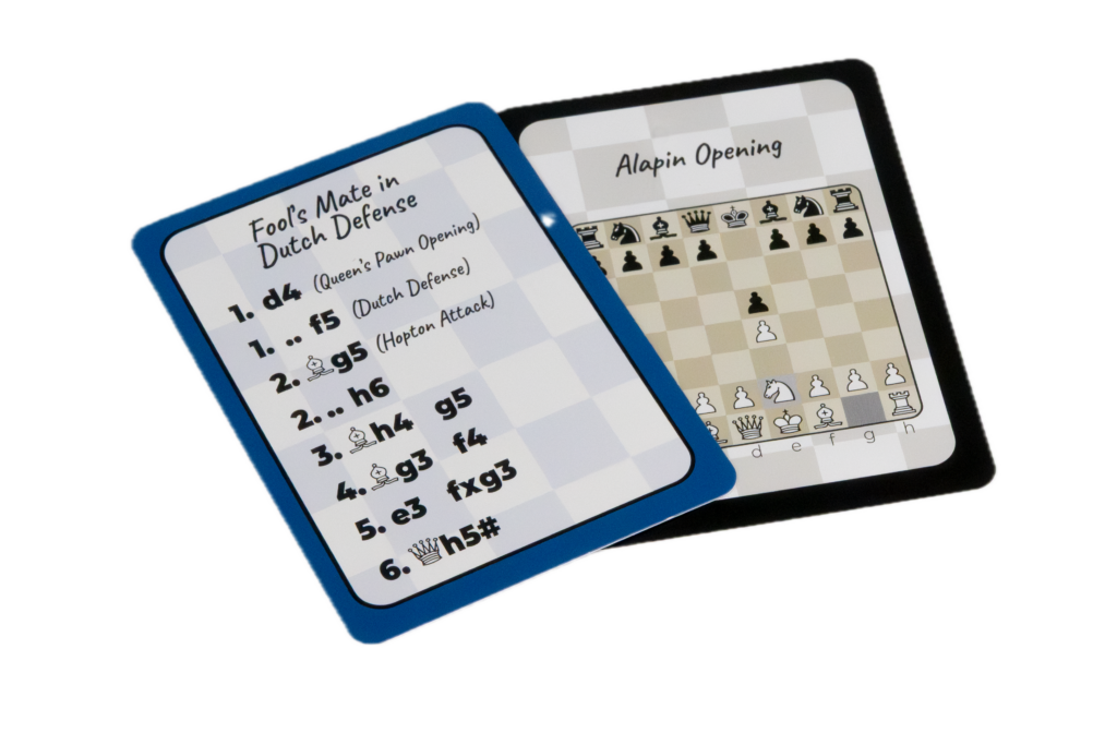 7&Mat c’est avant tout un jeu de 7 familles (pour ceux qui connaissent) mais c’est surtout 7 parties d’échecs rapides en 6 coups. Plus que des ouvertures ce sont des parties complètes, de la position de départ jusqu’au mat donné soit par les blancs, soit par les noirs. 7 parties qui défilent de carte en carte, de position en position et de notation en notation. Des parties rapides comme autant de prétextes de parler échecs, peut être pour la première fois.